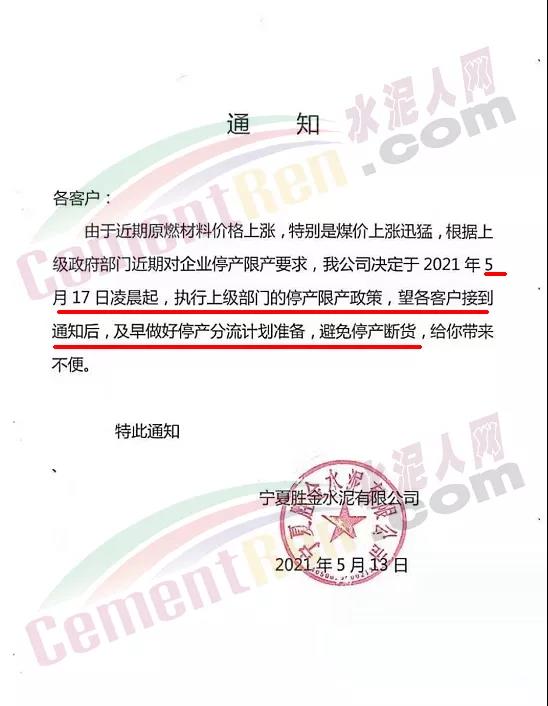 水泥人网通讯员消息:5月13日,宁夏胜金水泥有限公司通知,由于近期原燃材料价格上涨,特别是煤价上涨迅猛,根据上级政府部门近期对企业停产限产要求,公司决定于2021年5月17日凌晨起,执行上级部门的停产限产政策,望各客户接到通知后,及早做好停产分流计划准备,避免停产断货。