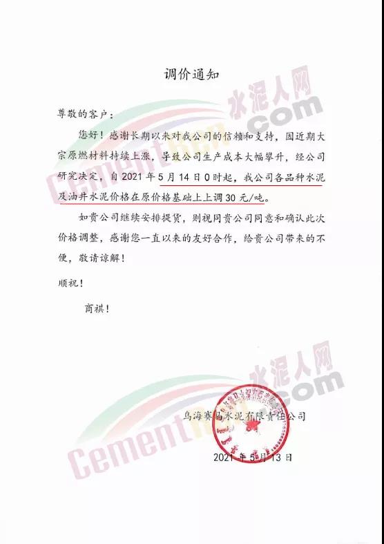 同日,乌海赛马有限责任公司通知,因近期大宗原燃材料持续上涨,导致公司生产成本大幅攀升,经公司研究决定,自2021年5月14日0时起,各品种水泥及油井水泥价格在原价格基础上上调30元/吨。