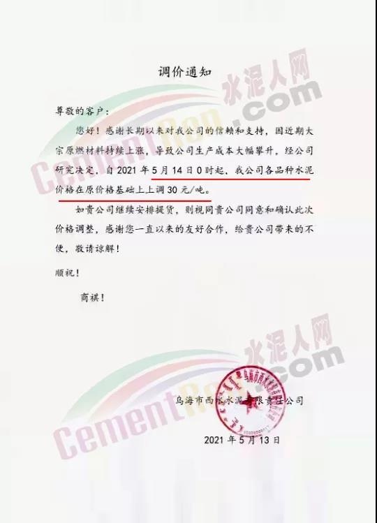 乌海市西水水泥有限责任公司通知,因近期大宗原燃材料持续上涨,导致公司生产成本大幅攀升,经公司研究决定,自2021年5月14日0时起各品种水泥价格在原价格基础上上调30元/吨。