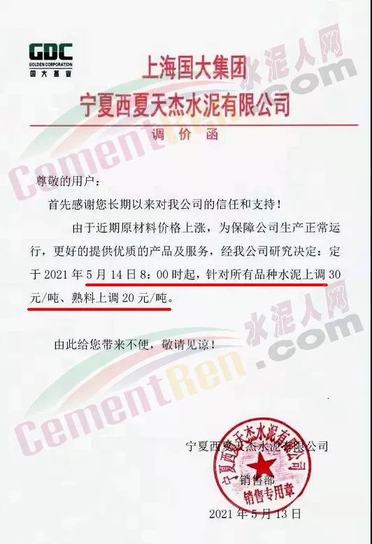 宁夏西夏天杰水泥有限公司通知,由于近期原材料价格上涨,为保障公司生产正常运行,更好的提供优质的产品及服务。经公司研究决定,于2021年5月14日8∶00时起,针对所有品种水泥上调30元/吨、熟料上调20元/吨。