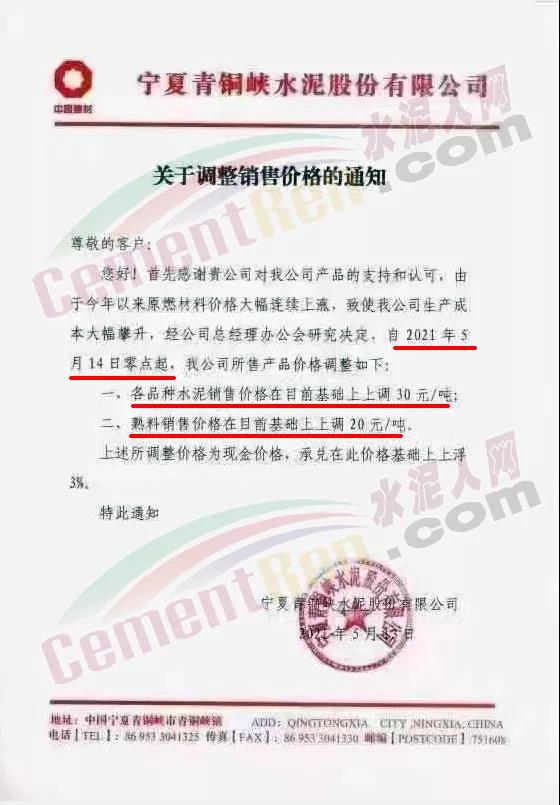 宁夏青铜峡水泥股份有限公司通知由于今年以来原燃材料价格大幅连续上涨,致使公司生产成本大幅攀升,经公司总经理办公会研究决定,自2021年5月14日零点起,各品种水泥销售价格在目前基础上上调30元/吨;熟料销售价格在目前基础上上调20元/吨。上述所调整价格为现金价格,承兑在此价格基础上上浮3%。