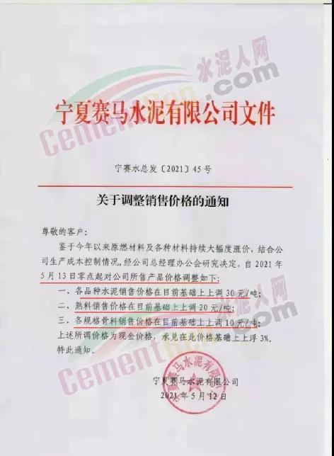 宁夏赛马水泥通知,鉴于今年以来原燃材料及各种材料持续大幅度涨价,结合公司生产成本控制情况,经公司总经理办公会研究决定,自2021年5月13日零点起对公司所售各品种水泥上调30元/吨,熟料上调20元/吨,各规格骨料销售价格上调10元/吨。上述所调价格为现金价格,承兑在此价格基础上上浮3%。