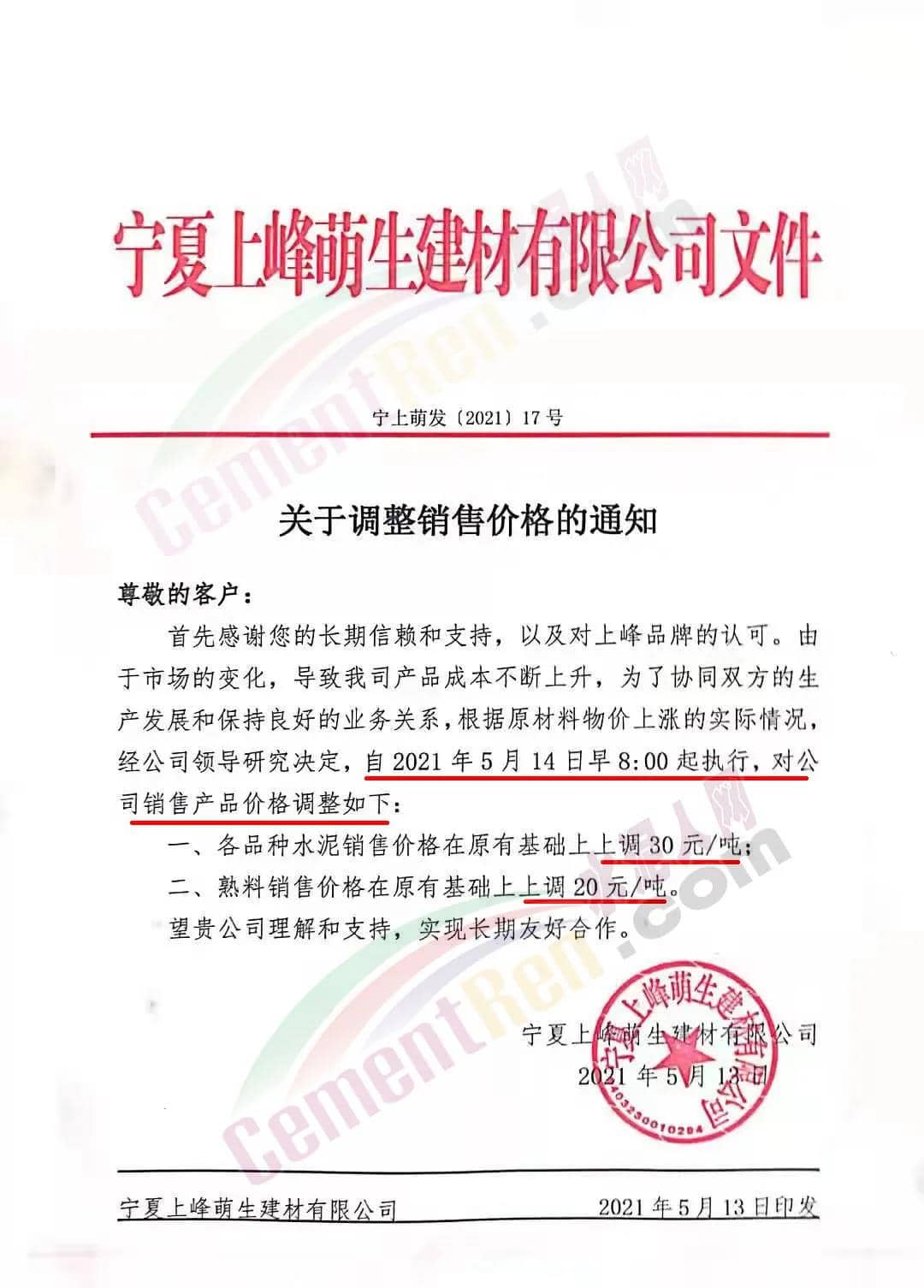 宁夏上峰萌生建材有限公司通知由于市场的变化,导致公司产品成本不断上升,为了协同双方的生产发展和保持良好的业务关系,根据原材料物价上涨的实际情况,经公司领导研究决定,自2021年5月14 日早8∶00 起执行,对公司各品种水泥销售价格在原有基础上上调 30 元/吨;熟料销售价格在原有基础上上调 20 元/吨。