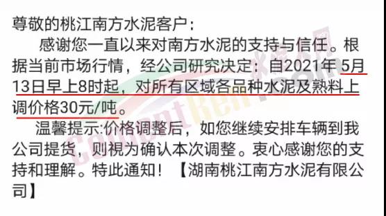 湖南桃江南方水泥通知,根据当前市场行情,经公司研究决定∶自2021年5月13日早上8时起,对所有区域各品种水泥及熟料上调价格30元/吨。