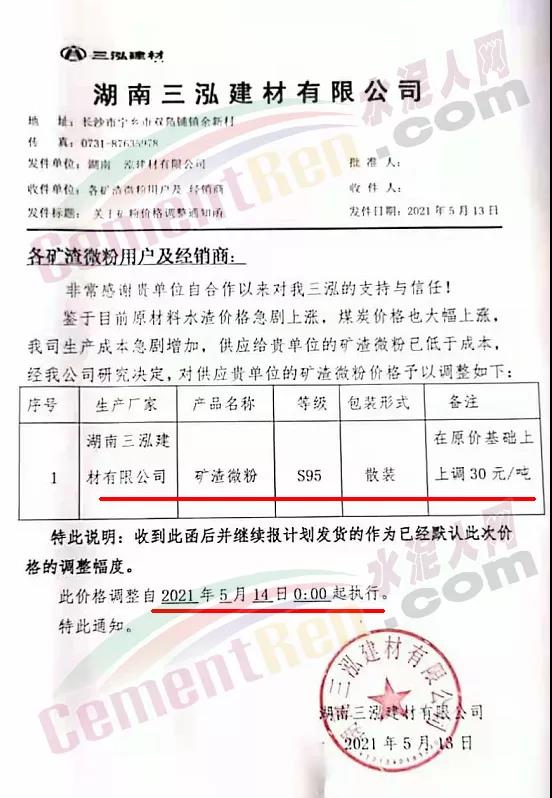 同期,湖南多家矿粉企业通知上调矿粉价格。湖南三泓建材有限公司通知称因原材料价格不断上涨,成本急剧增加,经公司研究决定,从2021年5月14日开始,对所有区域矿粉价格在原来基础上上调30元/吨。