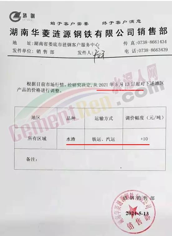湖南华菱涟源钢铁有限公司销售部通知,根据目前市场行情,经研究决定,从5月13日起对所有区域铁运、汽运水渣品种上调10元/吨。