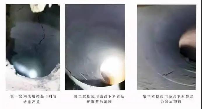 2020年10月份水泥窑检修时发现整体微晶下料管内没有任何结皮,下料管的接口条纹清新可见,工程技术人员对此状况惊叹不已,当场决定不做任何修正继续使用。又经过第二窑期的运行至今年四月底,再次停窑后发现下料管仍完好如初,于是顺利投入了第三个窑期的运行。