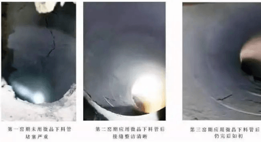 2020年10月份水泥窑检修时发现整体微晶下料管内没有任何结皮,下料管的接口条纹清新可见,工程技术人员对此状况惊叹不已,当场决定不做任何修正继续使用。又经过第二窑期的运行至今年四月底,再次停窑后发现下料管仍完好如初,于是顺利投入了第三个窑期的运行。