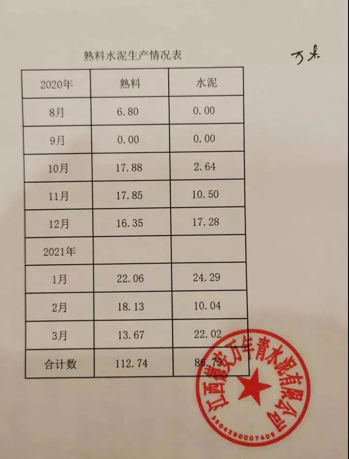 图2 德安万年青水泥有限公司熟料生产台账。截至今年3月底,已累计生产水泥熟料112.74万吨