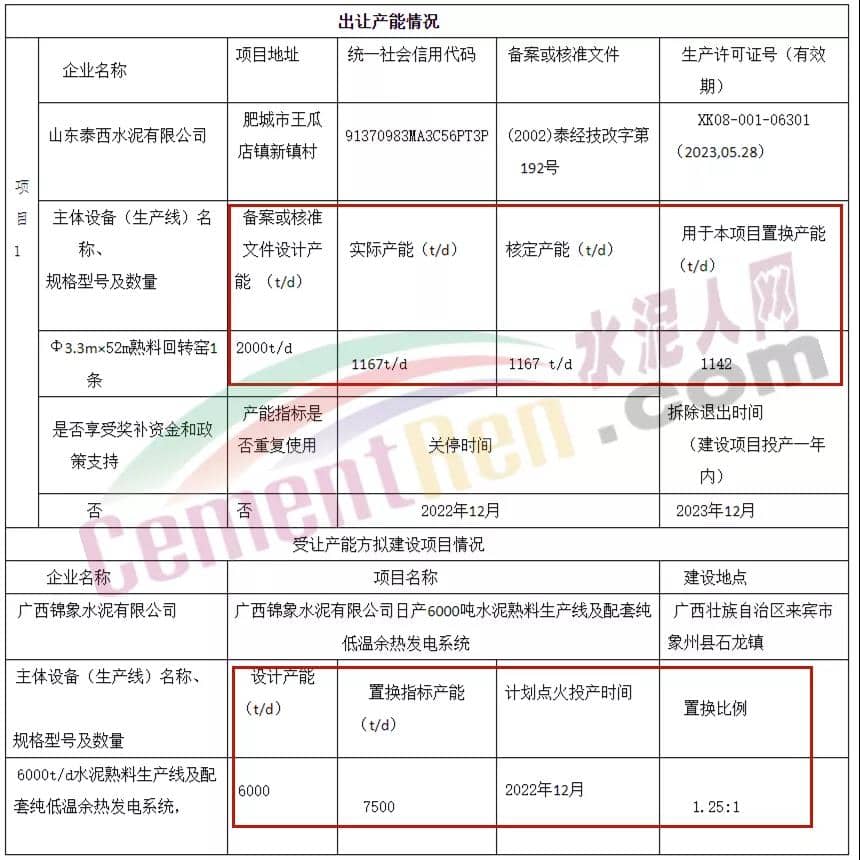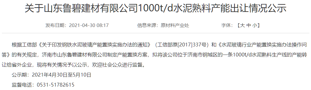 日前,山东省工业和信息化厅发布《关于山东泰西水泥有限公司水泥熟料产能出让情况公示》称,根据相关规定,拟将山东泰西水泥有限公司位于泰安市的一条1167t/d水泥熟料生产线的产能转让给省外企业,具体公示如下: