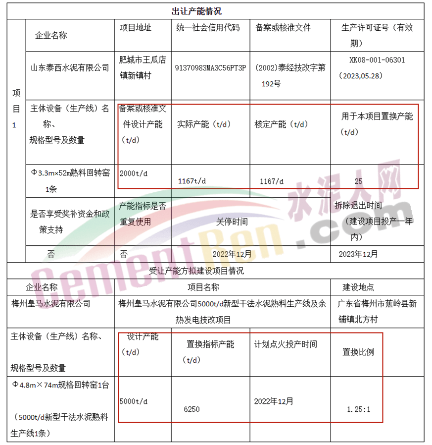 根据工信部《关于印发钢铁水泥玻璃产能置换实施办法的通知》(工信部原[2017]337号)和《水泥玻璃行业产能置换实施办法操作问答》的有关规定,泰安市山东泰西水泥有限公司制定产能置换方案,拟将该公司位于泰安市的一条1167t/d水泥熟料生产线的产能转让给省外企业,现将有关情况予以公示,欢迎社会公众进行监督。