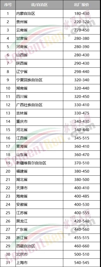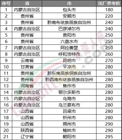 截止目前,水泥报价仍处于300元/吨以下的企业分布在甘肃省平凉市、贵州省安顺市、贵阳市、六盘水市、黔东南苗族侗族自治州、黔南布依族苗族自治州、黔西南布依族苗族自治州;内蒙古自治区阿拉善盟、巴彦淖尔市、包头市、鄂尔多斯市、呼和浩特市、乌海市、乌兰察布市;山西省吕梁市、朔州市、忻州市以及陕西省榆林市、云南省昆明市、河南省焦作市;辽宁省朝阳市等20多个地区。