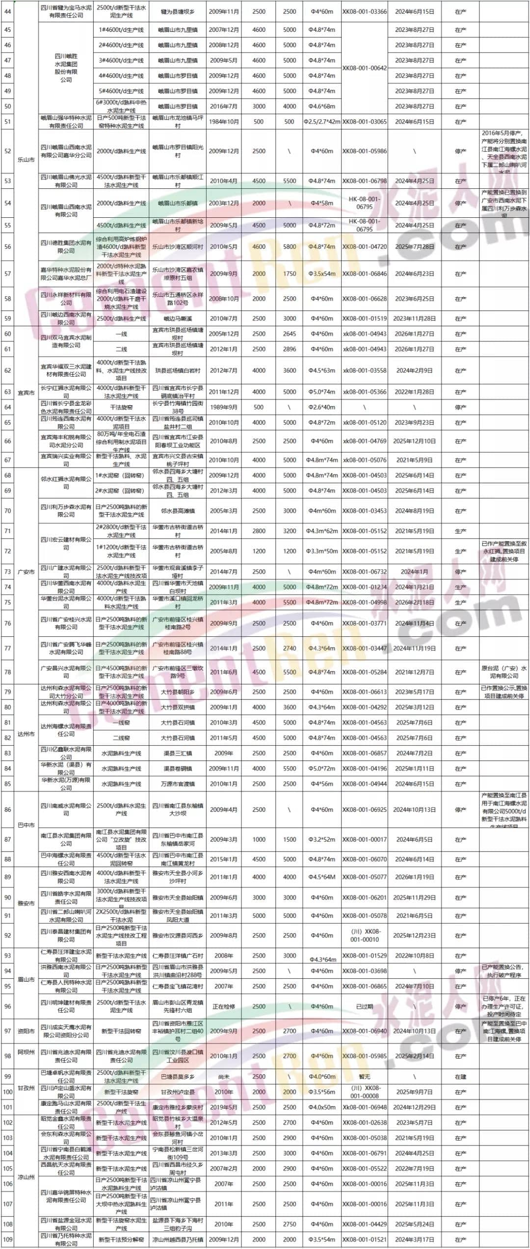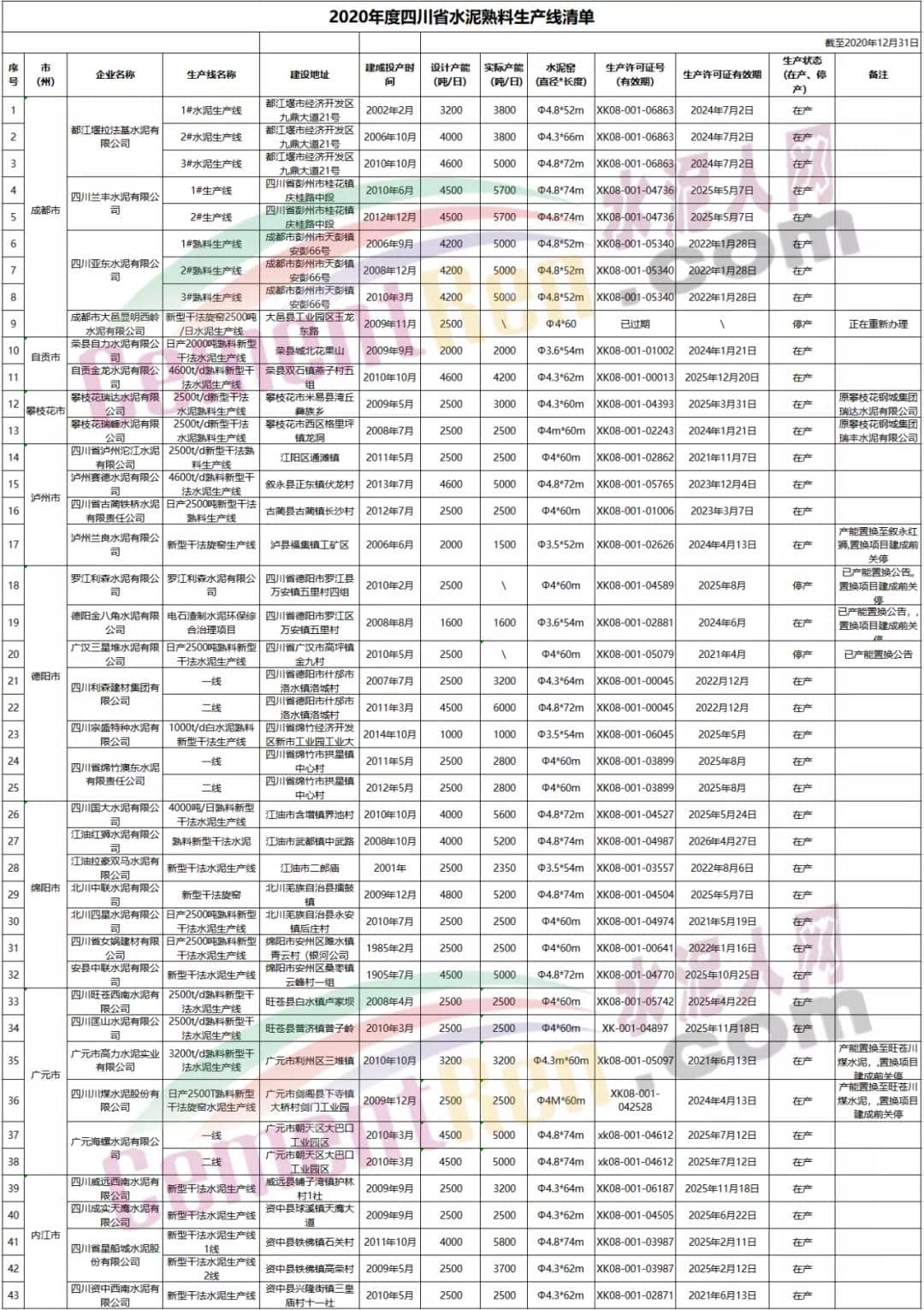 5月18日,四川省经济和信息化厅发布了《关于四川省水泥熟料和平板玻璃生产线清单的公示》,公示显示,截止到2020年12月31日,四川省共有109条水泥熟料生产线,合计产能9921.93万吨,其中10条停产,1条在建。