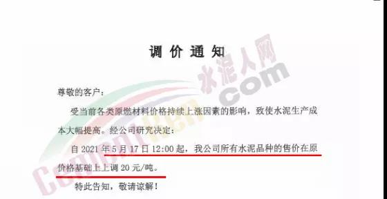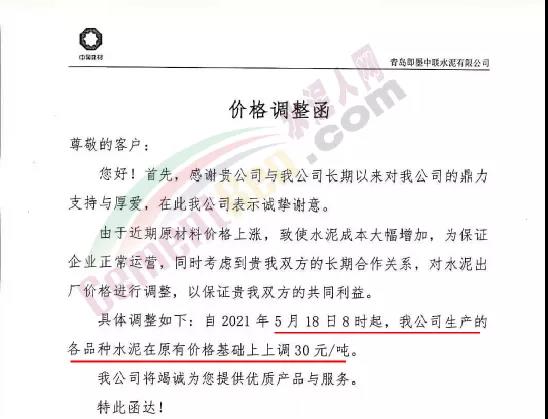 青岛即墨中联水泥有限公司通知,由于近期原材料价格上涨,致使水泥成本大幅增加。自5月18日8时起,公司生产的所有品种水泥在价格基础上上调 30元/吨。