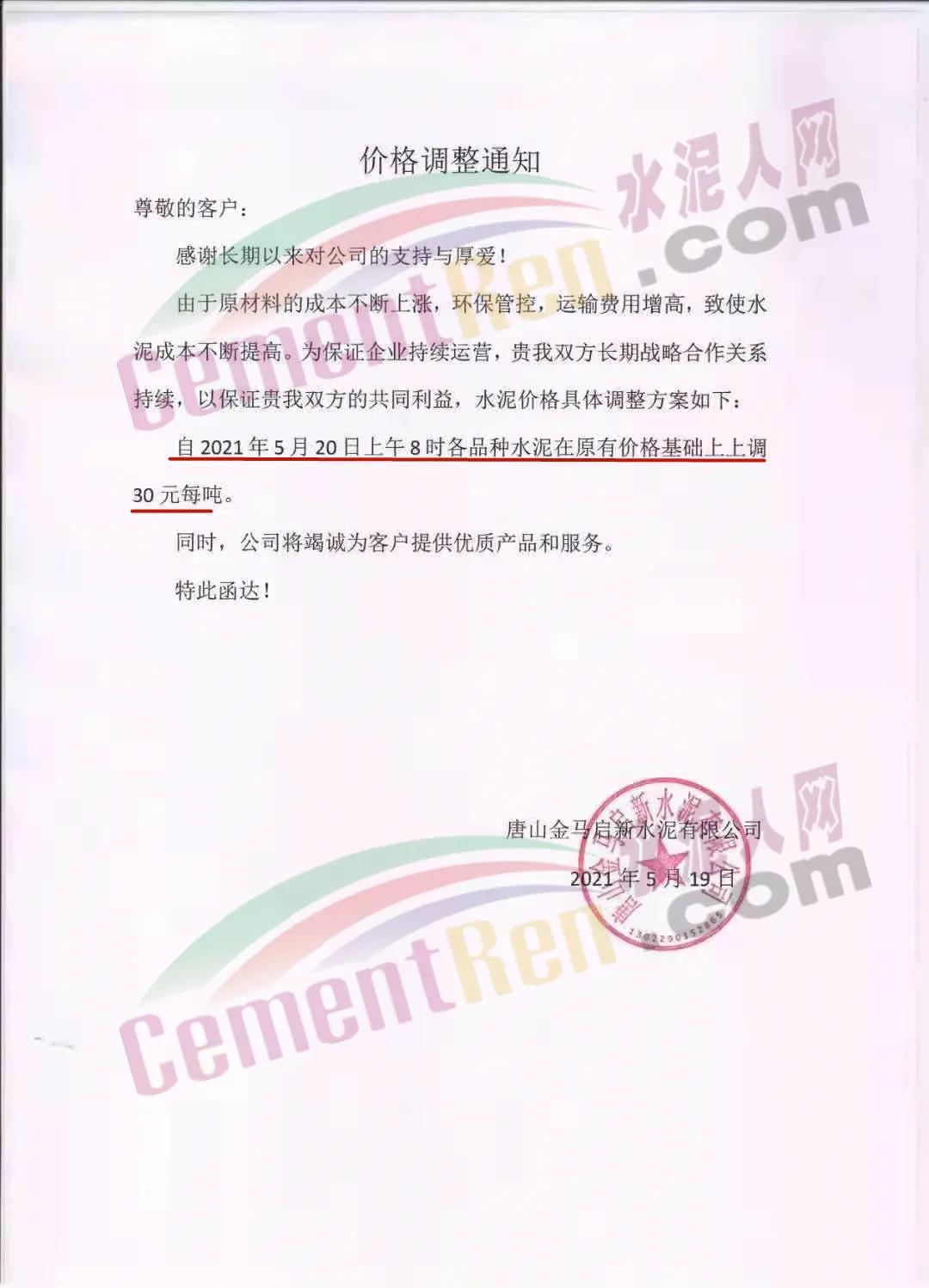 19日,唐山金马启新永泥有限公司通知,由于原材料的成本不断上涨,环保管控,运输费用增高,致使水泥成本不断提高。自2021年5月20日上午8时起各品种水泥在原有价格基础上上调30元/吨。