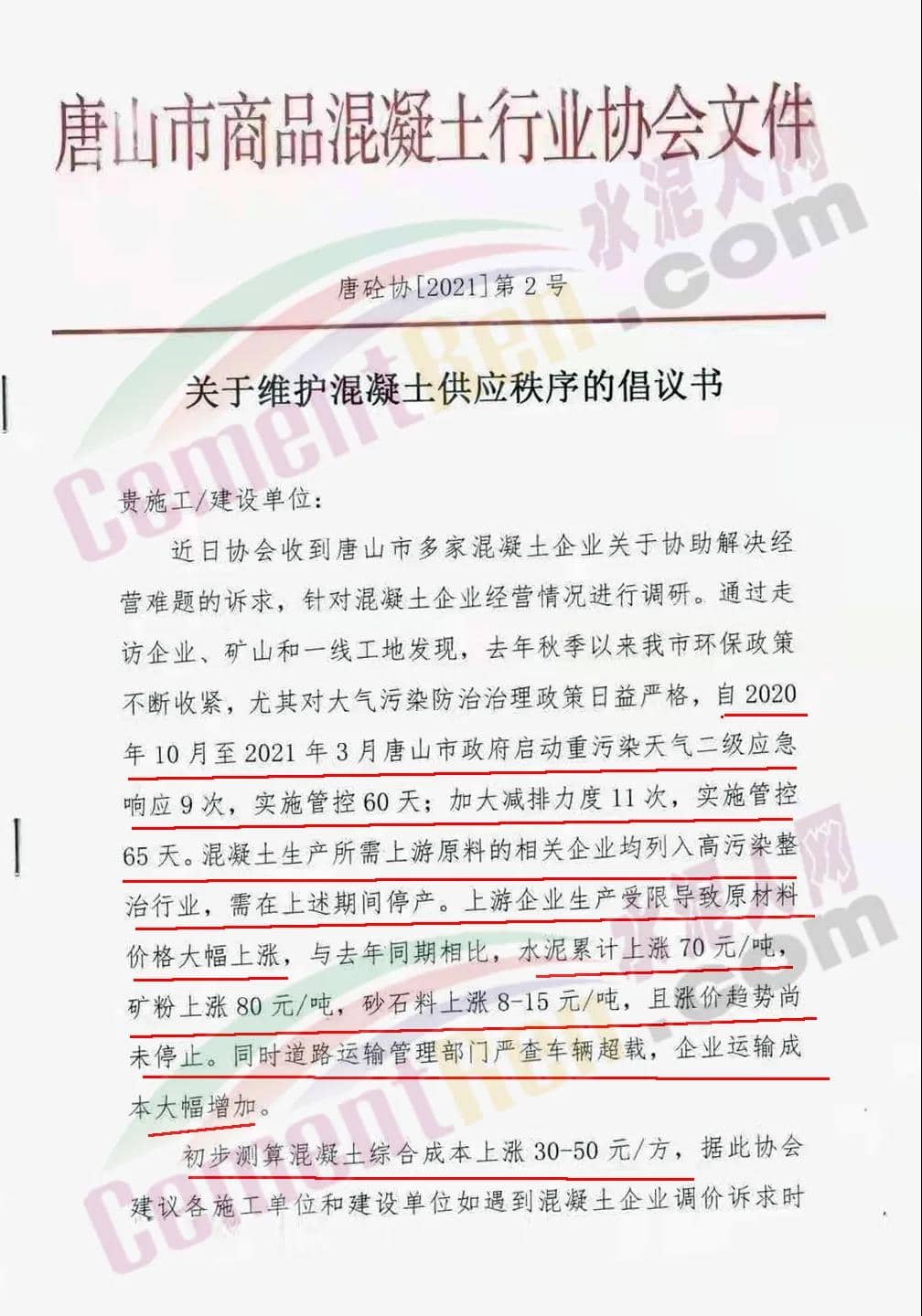 唐山市商品混凝土行业协会发布《关于维护混凝土供应秩序的倡议书》给下游施工建设单位称: