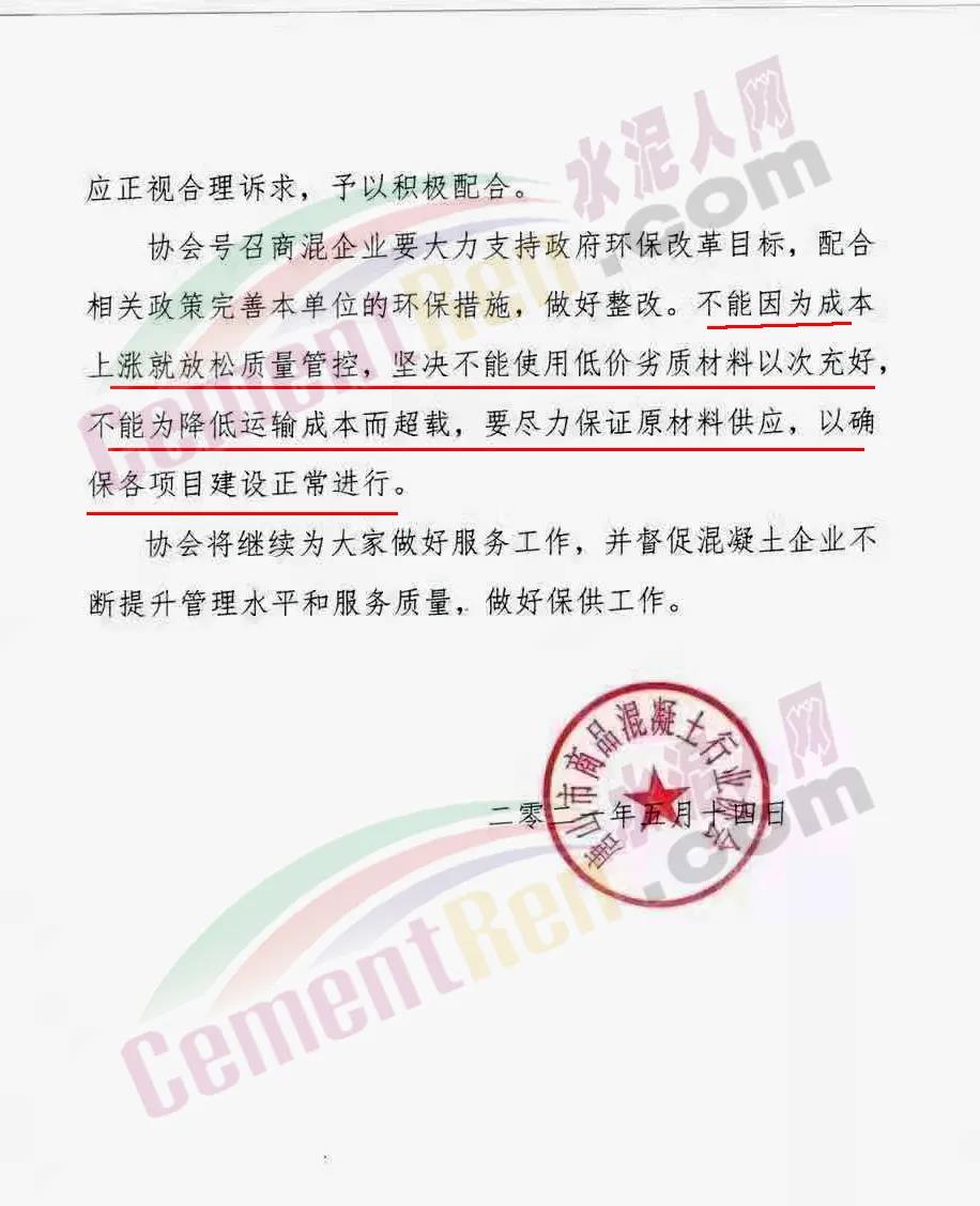 协会号召商混企业要大力支持政府环保改革目标,配合相关政策完善本单位的环保措施,做好整改。不能因为成本上涨就放松质量管控,坚决不能使用低价劣质材料以次充好,不能为降低运输成本而超载,要尽力保证原材料供应,以确保各项目建设正常进行。