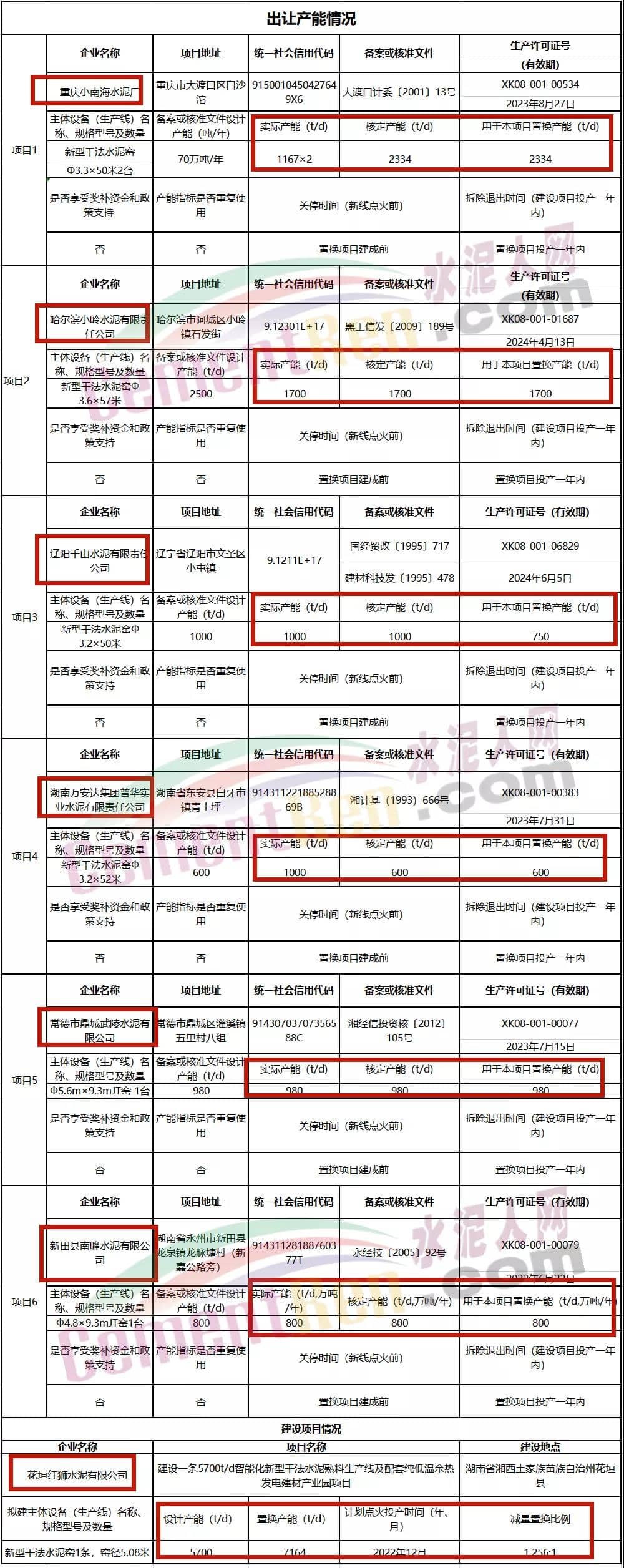 新建项目通过1.256:1产量置换方式,退出7164t/d产能,新建一条5700t/d熟料生产线。出让产能情况显示,共退出6个项目,分别为重庆小南海水泥2334t/d、哈尔滨小岭水泥有限公司1700t/d、辽阳千山水泥有限责任公司750t/d、湖南万安达集团普华实业水泥有限责任公司600t/d、常德市鼎城武陵水泥有限公司980t/d、新田县南峰水泥有限公司800t/d。