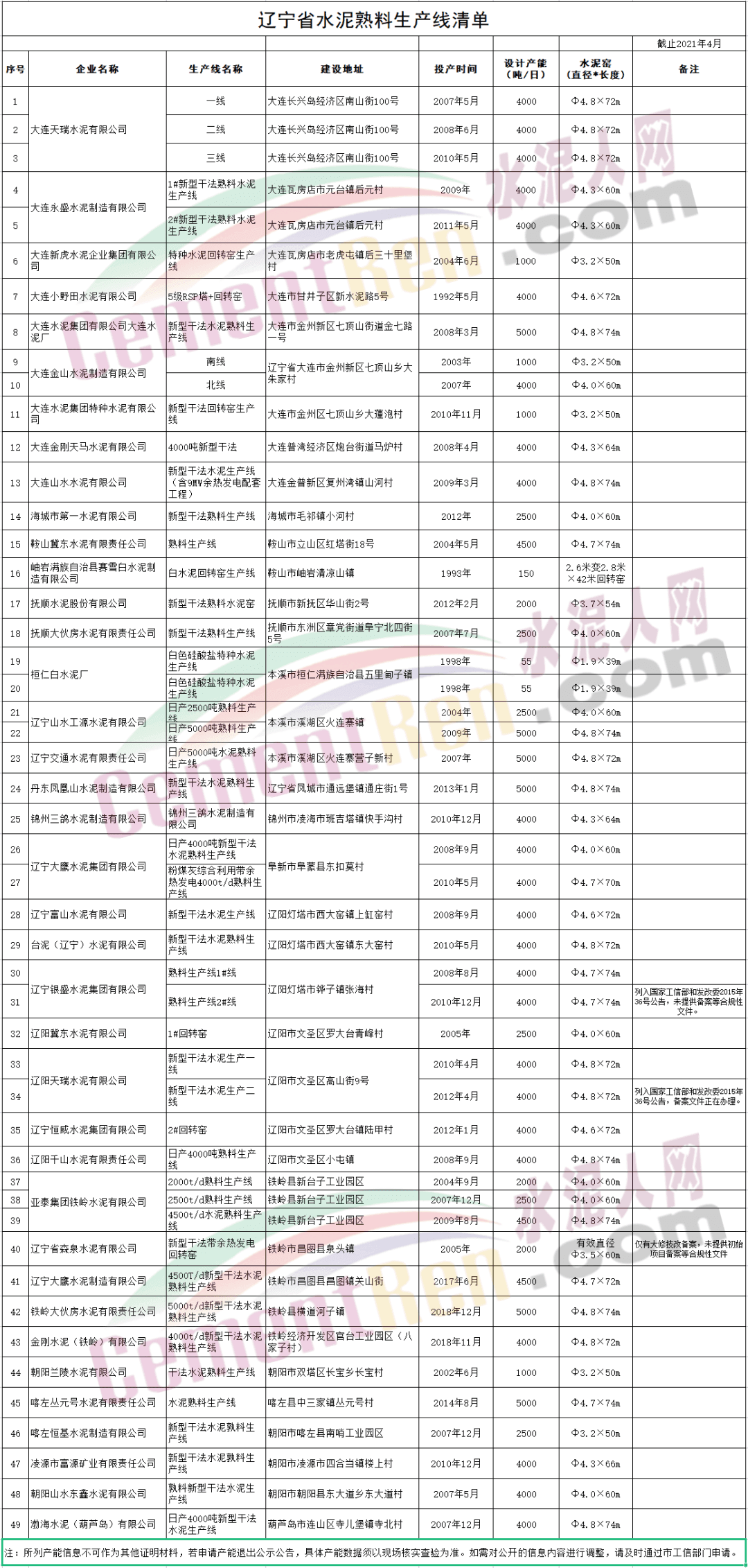 日前,辽宁省工业和信息化厅发布《辽宁省工业和信息化厅关于更新水泥熟料及平板玻璃生产线清单的公示》公示显示,截止到2021年4日,辽宁省共有49条水泥熟料生产线,合计产能4942.8万吨。