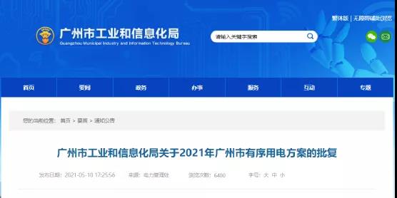 广州市工业和信息化局5月10日批复的《2021年广州市有序用电方案》显示,鉴于2021年全省电力供应偏紧,叠加夏季用电需求高峰期及枯水期,届时广州电网或将出现电力供应紧张甚至短缺局面,为此,颁布有关有序用电,工业错峰限电具体举措,有效期1年。