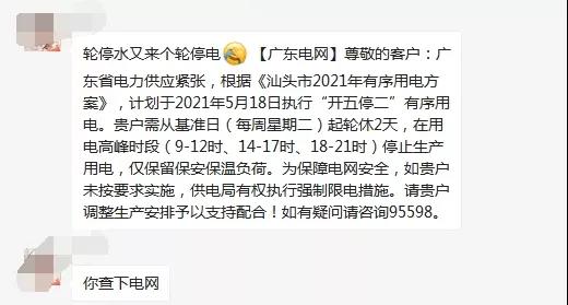 汕头市通知称,广东省电力供应紧张,根据《汕头市2021年有序用电方案》,计划于2021年5月18日执行“开五停二”有序用电。用户需从基准日(每周星期二)起轮休2天,在用电高峰时段(9-12时、14-17时、18-21时)停止生产用电,仅保留保安保温负荷。