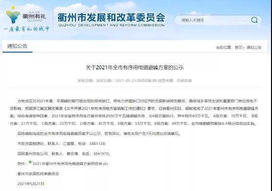 浙江省衢州市发展改革委发布《关于开展2021年有序用电方案编制工作的通知》称,2021年全省有序用电方案共安排2000万千瓦错避峰负荷,分6级方案执行,其中衢州市69万千瓦。A级方案:10万千瓦, B级方案:21万千瓦, C级方案:35万千瓦, D级方案:45万千瓦,E级方案:55万千瓦,F级方案:69万千瓦,全市错避峰预案按A-F级分级启动实施。