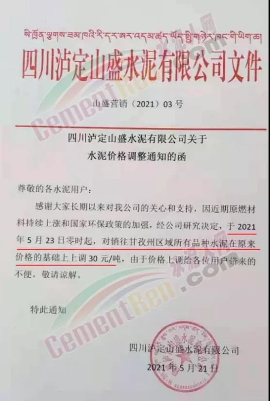 四川泸定山盛水泥有限公司通知,因近期原燃材料持续上涨和国家环保政策的加强,经公司研究决定,于 2021年5月23日零时起,对销往甘孜州区域所有品种水泥在原来价格的基础上上调 30 元/吨。