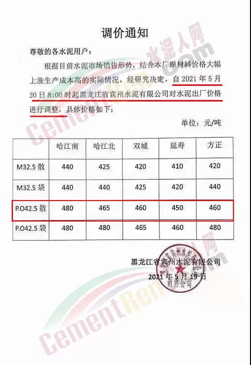 黑龙江宾州水泥有限公司通知,自5月20日8时起执行最新价格,PO42.5散装水泥各区域报价450~480元/吨。