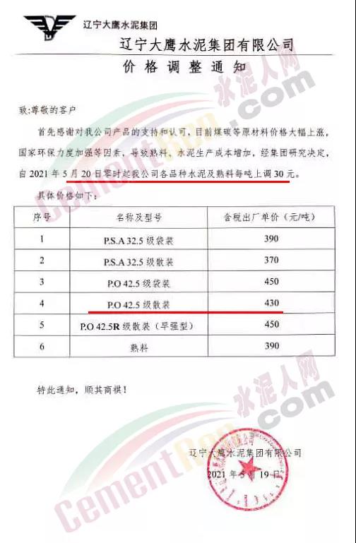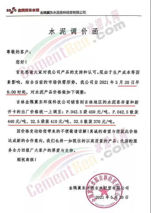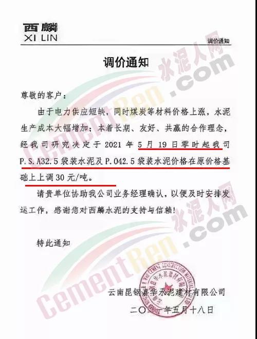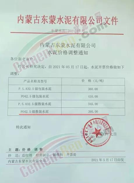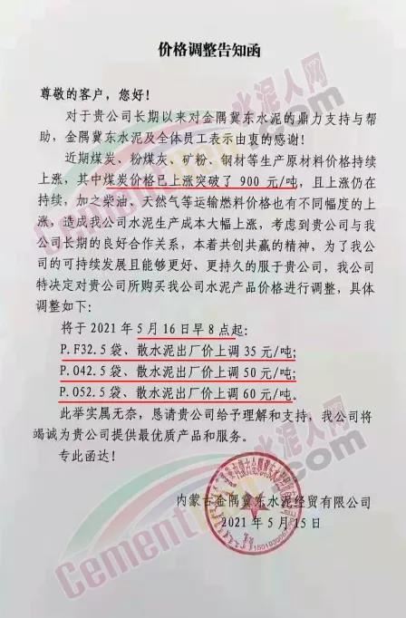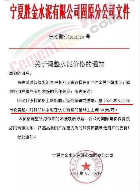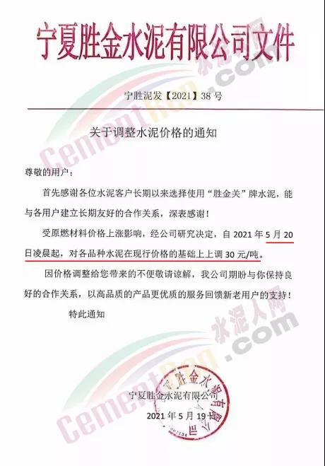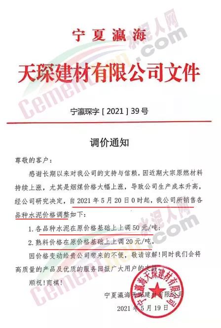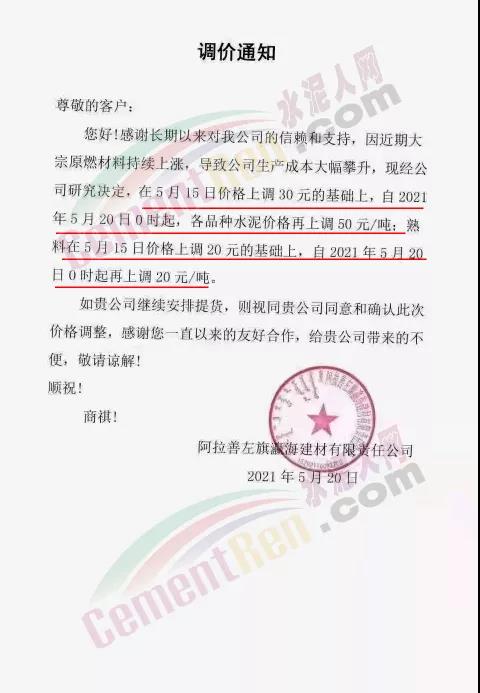 阿拉善左旗瀛海建材有限责任公司、宁夏瀛海天琛建材通知,因近期大宗原燃材料持续上涨,导致公司生产成本大幅攀升,经公司研究决定,在5月15日上调水泥和熟料价格30元/吨、20元/吨基础上再次上调50元/吨、20元/吨。两次累计水泥上调80元/吨,熟料上调40元/吨。