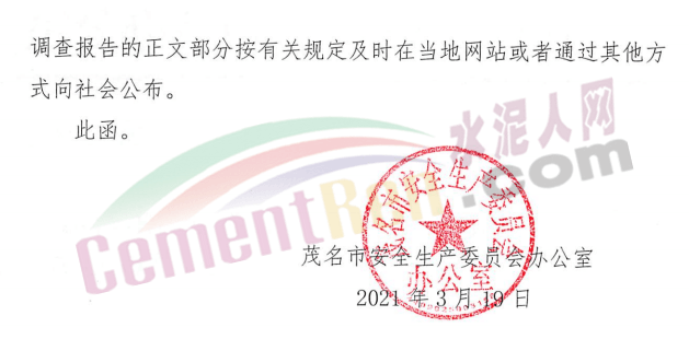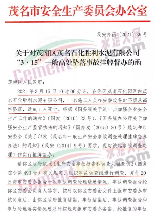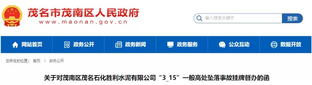 日前,广东省茂名市茂南区人民政府发布《关于对茂南区茂名石化胜利水泥有限公司“3·15”一般高处坠落事故挂牌督办的函》称,根据相关通知要求,对茂南区茂名石化胜利水泥有限公司“3·15”一般高处坠落事故调查处理工作实行挂牌督办。具体通知如下: