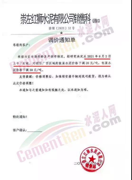 根据当前市场形势,经研究决定,我公司于2021年6月2日07:00起对销往广西区域的散装水泥价格下调20元/吨,包装水泥价格下调30元/吨。