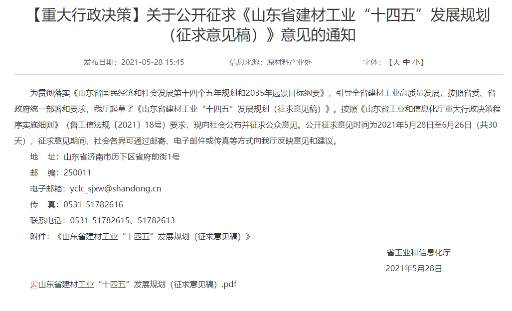 山东省工业和信息化厅近日发布了《山东省建材工业“十四五”发展规划(征求意见稿)》(以下简称《规划》)。《规划》提出,整合退出低效产能。严格执行产能置换政策,严禁新增水泥熟料、粉磨产能,严禁省外水泥熟料、粉磨产能转入山东省。除特种水泥熟料和化工配套水泥熟料生产线外,2500吨/日以下的水泥熟料生产线全部整合退出。直径3.2米及以下水泥磨机全部整合退出,退出产能可进行减量置换。通过产能置换新建的水泥熟料生产线规模不得低于4000吨/日,水泥磨机直径不得小于3.8米。