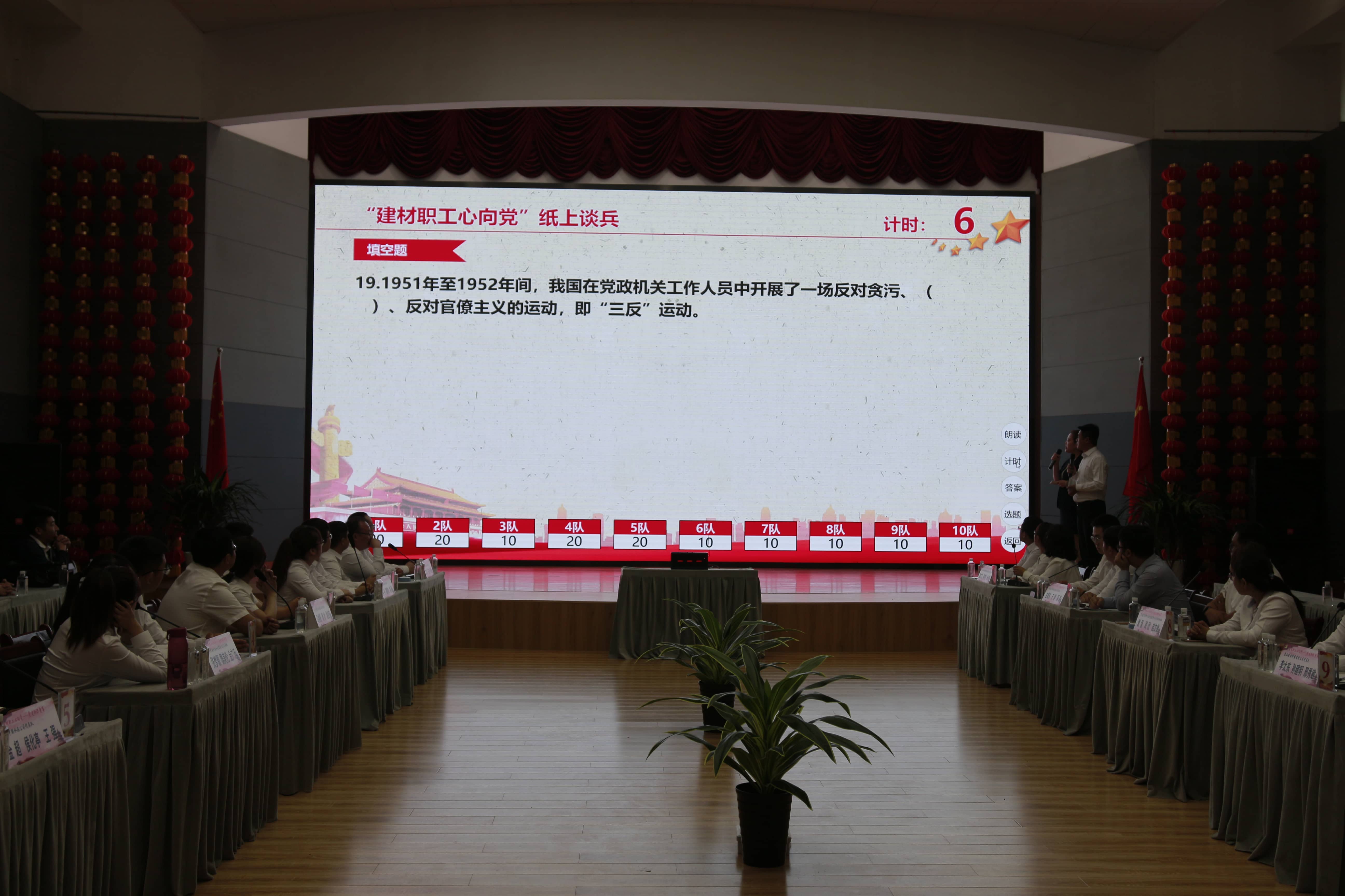 在活动现场,10支代表队充分展现了建材企业职工的政治理论功底和斗志昂扬的精神状态,这是一场别开生面的智慧较量和脑力比拼。经过纸上谈兵、飞夺泸定桥、回顾党的历史、三方会谈、黄金60秒、开弓亮剑六个环节的激烈比拼角逐,最终确定了比赛的一二三等奖。