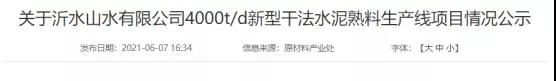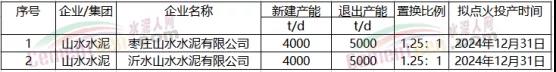 沂水山水水泥有限公司通过退出枣庄山水500t/d、烟台兴昊山水水泥有限公司2000t/d、东阿山水东昌水泥有限公司2500t/d,合计5000t/d熟料产能新建一条4000t/d熟料生产线。