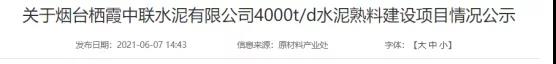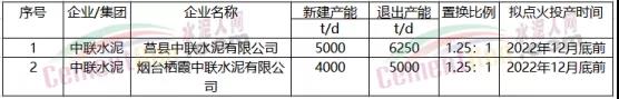 烟台栖霞中联水泥有限公司通过退出烟台栖霞中联水泥有限公司500t/d、泰山中联水泥有限公司2000t/d、以及自有2500t/d熟料产能,新建一条4000t/d熟料生产线,置换比例1.25:1。