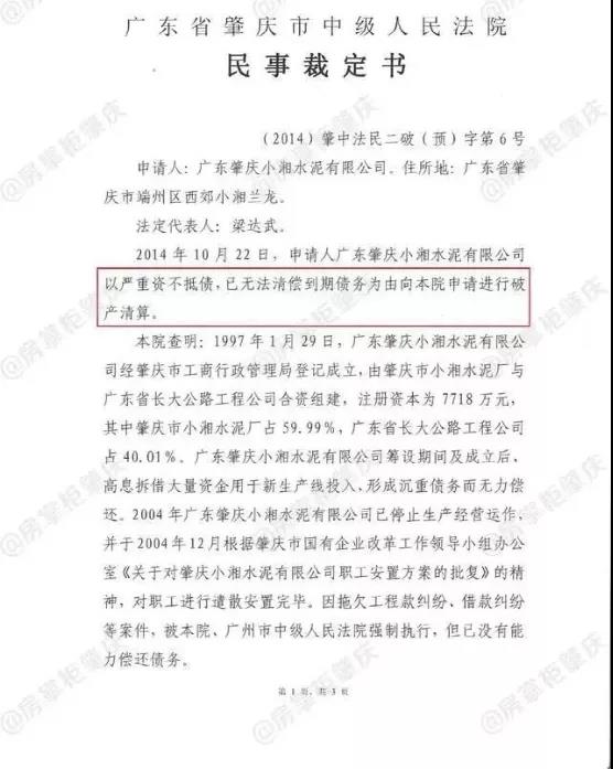 今年5月初阿里司法拍卖平台挂出了肇庆小湘水泥有限公司的拍卖公告。起拍价2825.9904万元。