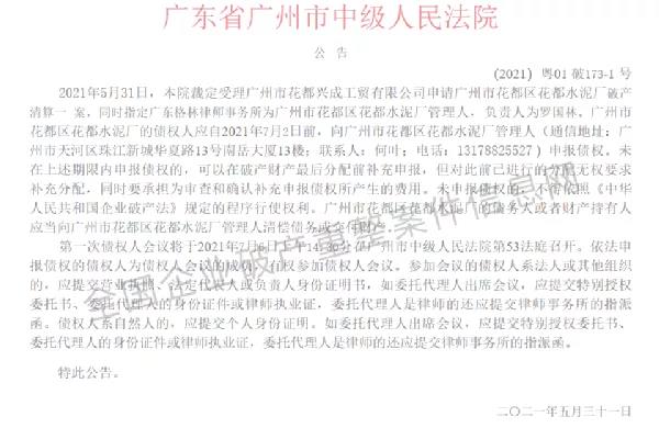 广州市法院系统公告曾发布《裁定受理广州市花都兴成工贸有限公司申请广州市花都区花都水泥厂破产清算一案》公告。公告文件提到广州市法院裁定受理广州市花都兴成工贸有限公司申请申请广州市花都区花都水泥厂破产清算一案,同时指定广东格林律师事务所为广州市花都区花都水泥厂管理人,负责人为罗国林。广州市花都区花都水泥厂的债权人应自2021年7月2日前,向广州市花都区花都水泥厂管理人申报债权。
