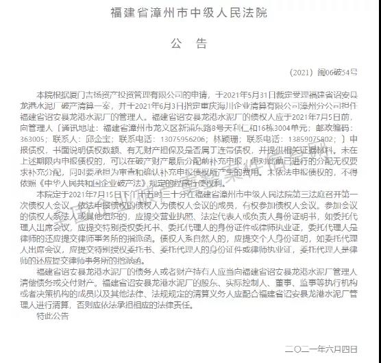 福建省漳州市中级人民法院公告于2021年5月31日裁定受理福建省诏安县龙港水泥厂破产清算一案,并于2021年6月3日指定重庆海川企业清算有限公司漳州分公司担任福建省诏安县龙港水泥厂的管理人。