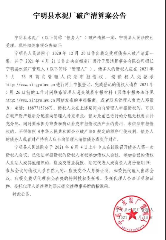 宁明县水泥厂破产清算案公告提到,宁明县水泥厂破产清算一案,宁明县人民法院已受理。宁明县人民法院于2020年12月20日作出裁定受理债务人破产清算一案,并于2021年4月21日作出决定指定广西行于思清算事务有限公司担任宁明县水泥厂管理人。
