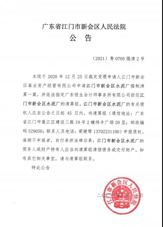 广东省江门市新会区人民法院公告,已经于2020年12月25日裁定受理申请人江门市新会区基业资产经营有限公司申请江门市新会区水泥厂强制清算一案,并依法指定广东恒生会计师事务所有限公司担任江门市新会区水泥厂的清算组。