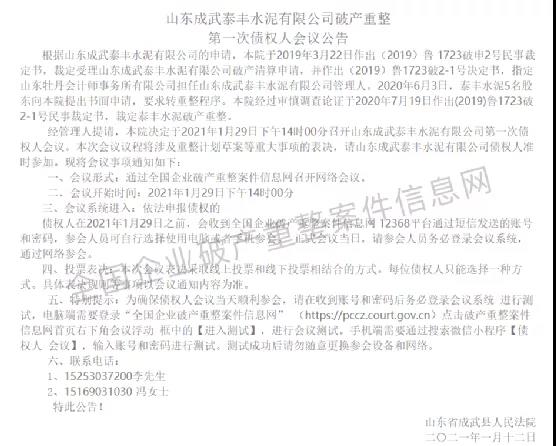 2021年2月24日上午,章丘法院组织召开山东交通水泥厂、山东路港水泥有限公司合并破产案第一次债权人会议,债权人、债务人、债务人主管部门、债务人出资人、职工代表、审计机构、管理人计50余人参加了会议。