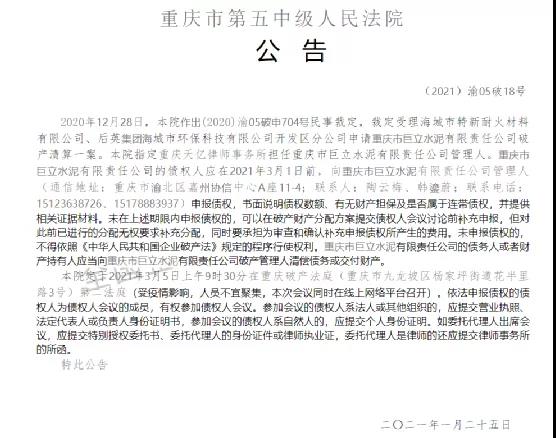 重庆第五中级人民法院公告,2020年12月28日,裁定刯海城市特新耐火材料有限公司、后英集团海城市环保科技有公司开发区分公布申请重庆市巨立水泥有限公司破产清算案,指定重庆天亿律师事务所担任重庆市巨立水泥有限责任管理人。