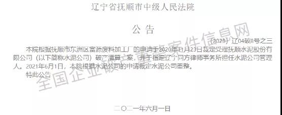 辽宁扶省抚顺市中级人民法院公司,于2020年11月23日裁定受理抚顺水泥股份有限公司破产清算一案,并指定辽宁同方律师事务所担任水泥公司管理人。