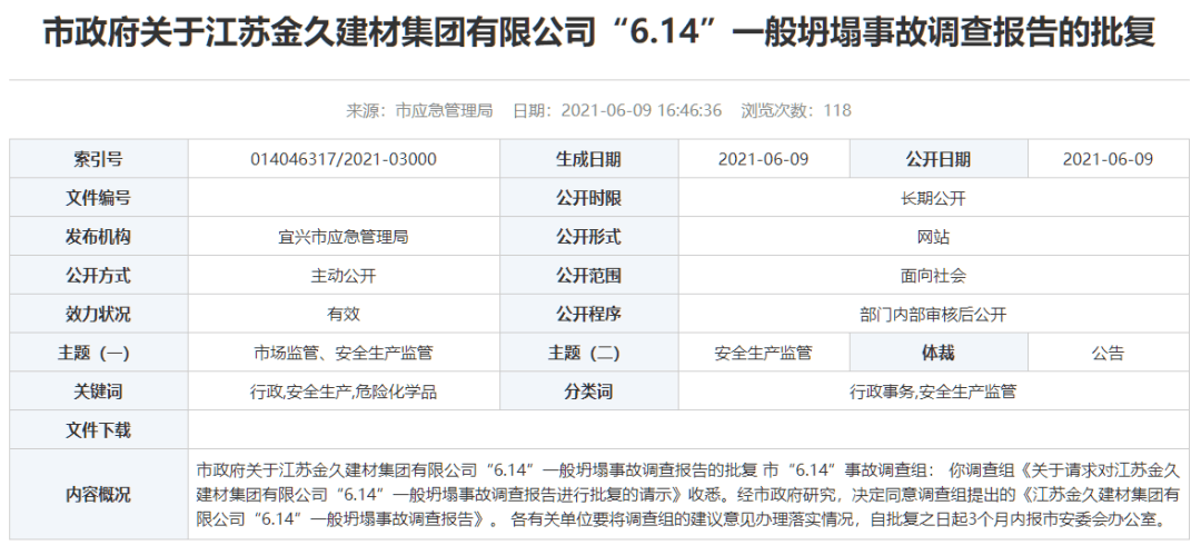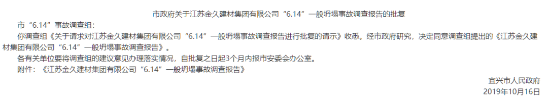 经调查认定,江苏金久建材集团有限公司“6.14”坍塌事故是一起一般生产安全责任事故。