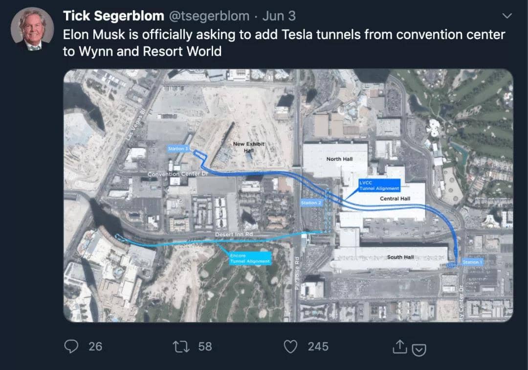 据外国媒体报道,6月3日,克拉克县专员Tick Segerblom发表推特公布了拟挖隧道的地图,该隧道从拉斯维加斯会议中心(Las Vegas Convention Center)向西延伸至永利度假村(Wynn Resorts)旗下的两栋赌场酒店永利(Wynn)和安可(Encore)。6月9日,永利度假村也正式宣布将和无聊公司合作,并已经提交了项目的土地使用申请。