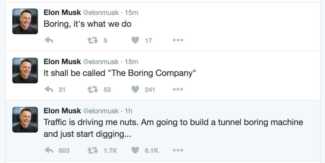 无聊公司的成立起源于一次堵车,2016年12月17日被堵在街上一动不动的马斯克连发3条推特,宣布要成立一家公司专门解决堵车问题。