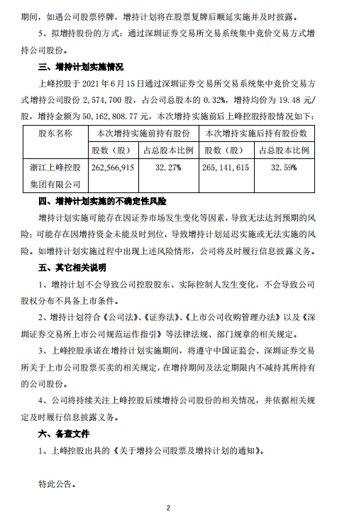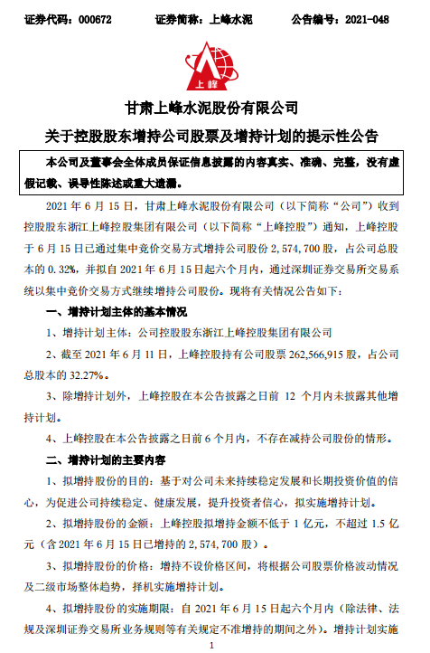 6月15日晚间上峰水泥公告,控股股东浙江上峰控股集团增持公司股份2,574,700股,并发布了拟增持1~1.5亿元的增持计划。大股东增持有力彰显了对公司的发展信心。