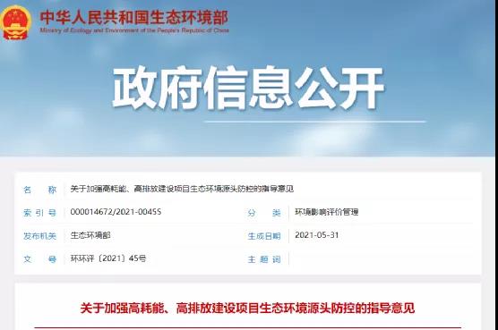 日前,中华人民共和国生态环境部发布《关于加强高耗能、高排放建设项目生态环境源头防控的指导意见》,要求推进“两高”行业减污降碳协同控制,新建、扩建“两高”项目应采用先进适用的工艺技术和装备,单位产品物耗、能耗、水耗等达到清洁生产先进水平。