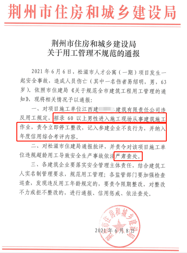 2021年6月6日,荆州市一项目发生一起安全事故,造成人员伤亡(其中一名伤者男,63岁)。依照市住建局《关于规范全市建筑工程用工管理的通 知》,将相关情况予以通报: