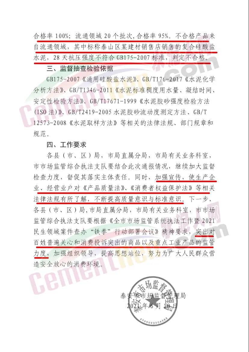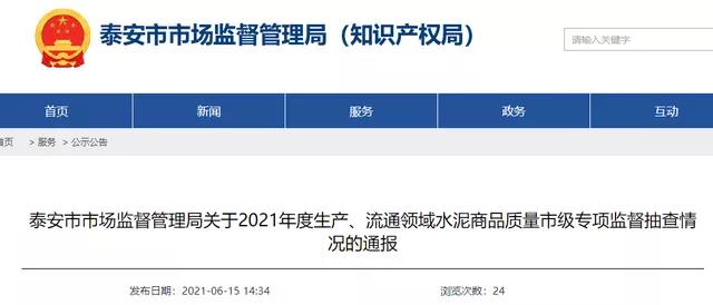 日前,山东省泰安市市场监督管理局发布关于2021年度生产、流通领域水泥商品质量市级专项监督抽查情况的通报。